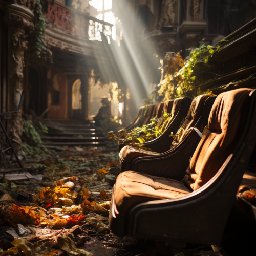 old ruined and abandoned movie theater in Kerala, sun light leaking from celing --s 750