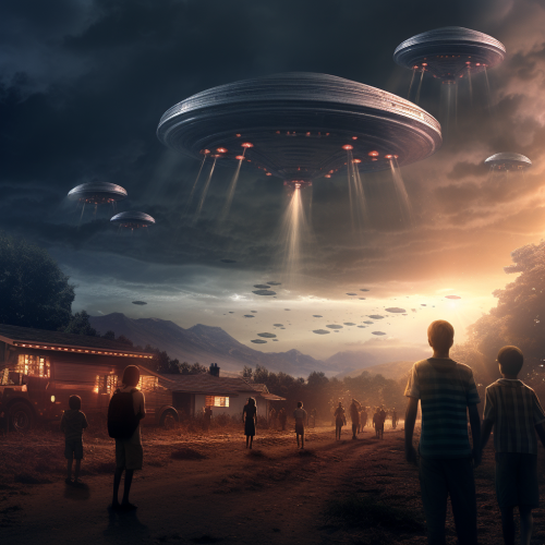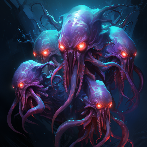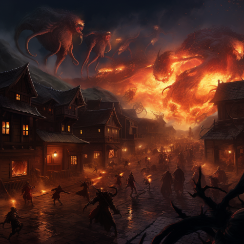eldritch monsters attacking and pillaging a village at night, with houses in flames, fantasy, hyper realistic