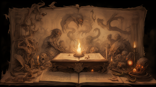 Huge ancient book with drawing of monsters on wooden table, detailed depiction of monsters, each seemingly leaping off the aged parchment, surrounded by a dimly lit room with a single candle flickering, ambience of eerie calmness, Painting, utilizing pastel colors and employing soft, blended brush strokes with a focus on achieving a simultaneously dreamy and ominous aesthetic, --ar 16:9 --v 5.0