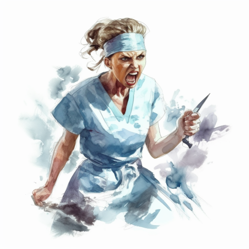 watercolor style, beautiful nurse, angry, attacking people with a scalpel, isolate on white background, --no background