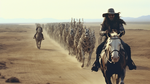 buffalo riders riding through plains covered in bones, vhs still from 1980 film "excalibur", dark fantasy, cinematic --s 750 --v 5.1 --style raw --ar 16:9
