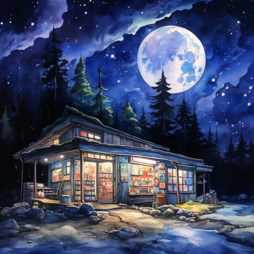convenience store in a remote place in the middle of the night, with only the moon floating alone in the night sky and no stars, the lights on the sign are blinking as if they were going to go out at any moment, Illustration, watercolor painting