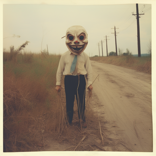 a man with a giant head mask, laughing stands on an abandoned road with a cynical smile, creepy photorealistic, polaroid retro style