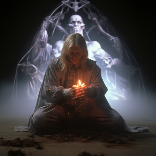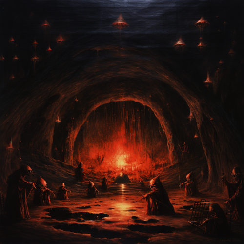 secret sect summoning The Devil in dark cave with portal in the background