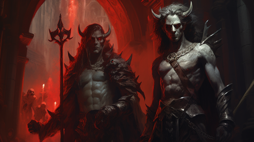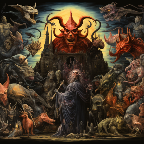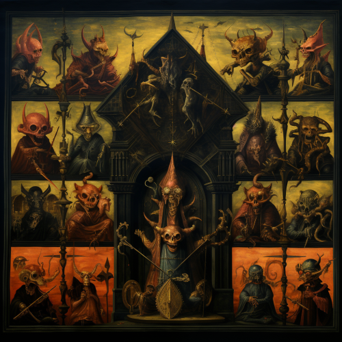 In the style of a Polyptych cram in all the demon's hierarchy, spirits, ghouls, monsters, devils, jinn, hoardes, legions, principalities, air thrones, low earth thrones, warlocks, witches, gremelins. illustrate love, power, and hate.