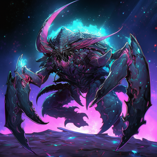 Grimdark cosmic eldritch local crab hunter, full body, anime style, horror fantasy, dynamic pose, digital art, masterpiece painting, ultra detailed, ultra high definition, 8K resolution, 3D shading, superior quality, cover illustration, complex design, luminous highlights, rich vibrant colours, hyperrealistic, meticulously hyper detailed, high contrast, artstation --niji 5