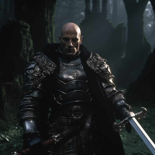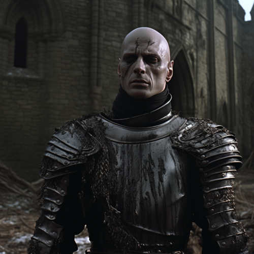 dvd screengrab, dark fantasy film from 1982, evil paladin, wearing black armor, 14th century armor, bald, pale skin, sunken eyes, in a graveyard