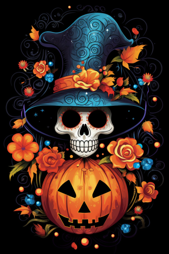 colorful festive sparkle warm cozy , illustration, Sugar Skull Skeletons, Nightmare Before Christmas , Jack-O-Lantern, cute bats, fall leaves, halloween candy, witches hat, soft dreamy, Halloween, happy, american flag, poisiettia flower winter sparkle , colorful festive sparkle warm cozy , illustration, round --ar 2:3