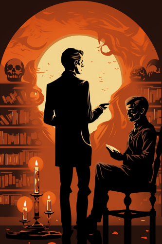 stylized drawing of A man stands in the foreground looking at a framed portrait hanging on the wall. The setting is filled with gothic furniture and bookshelves. Haunting mood, eerie, creepy, existential dread. In the style of flat design vector illustration, royalty free vector illustration, minimal, silk screen, Saul Bass, Tom Whalen, Oktopolis, vector, minimalist cartooning, stencil, limited color palette --stylize 500 --ar 2:3 --no windows, no city, no trees