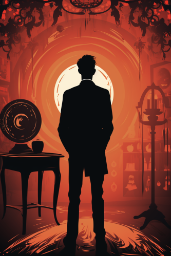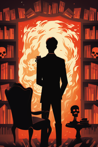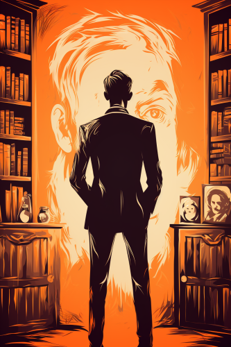 stylized drawing of A man stands in the foreground looking at a framed portrait hanging on the wall. The setting is filled with gothic furniture and bookshelves. Haunting mood, eerie, creepy, existential dread. In the style of flat design vector illustration, royalty free vector illustration, minimal, silk screen, Saul Bass, Tom Whalen, Oktopolis, simple, vector, minimalist cartooning, stencil, retro, limited color palette --stylize 500 --ar 2:3 --no windows, no city, no trees