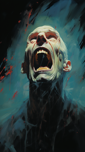 Horror movie footage, nosferatu, vampire fangs, red dripping from the mouth, cloudy misty eyes, madness in the background, film poster layout, blue pink green COLORS, oranges glow, strange light, glow in the dark, oilpainting, adding a touch of realism and depth, By loish, by alex ross, by frank frazetta --ar 9:16 --s 250 --v 5.2