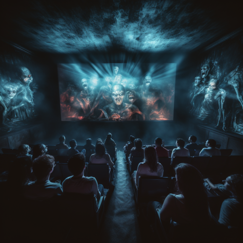 top perspective view of 20 people seated inside huge room with scary horror projection screen content on the walls around them, horror mood, photorealistic, 8k, dark lighting, HDR, high resolutions, shot on IMAX Laser, intricate details