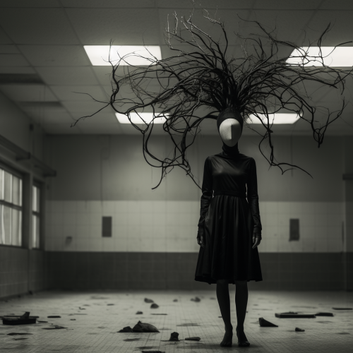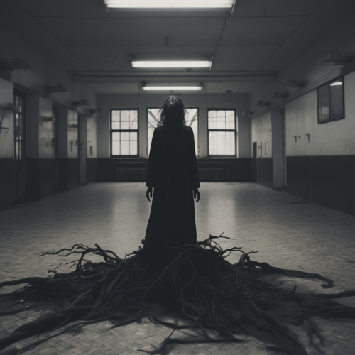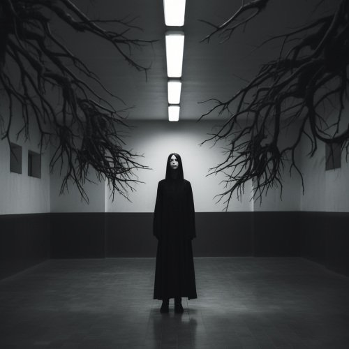 a levitating avant-garde woman with a black baggy clothes and mask, standing up in the middle of an empty hall, dark trees roots retaining her feets, the scene happen in psychiatric hospital from 1967, a dark composition reflecting the rebellious nature of black metal, duotone, black and white