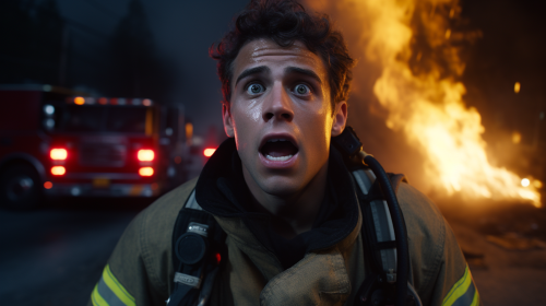 a 20 year old male firefighter, Shock and Realization, stark lighting, horrified, --ar 16:9 --seed 3116063080