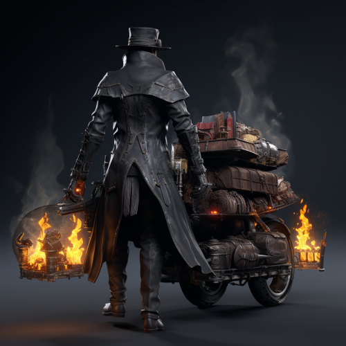 a man, 3 .60m tall, thin, wearing a black top hat, black overcoat, carrying a pizza delivery backpack, riding on a motorcycle, the motorcycle is a speed model, the streets styled bloodborne, rear view, light white aura around the character, ultra-detailed, intricate details, 8K, Super detailed, Full color, Volumetric lightning, HDR, Realistic, Unreal Engine, horror film --v 5.2