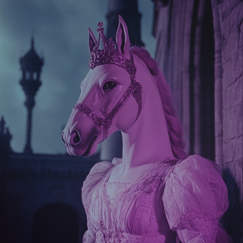 Close-up Low resolution screengrab of 1950's Super panavision 70 movie. Retro in colour. A humanoid figure with the head of a white horse. Wearing a dress and a tiara. The setting is the exterior of a dark fantasy castle. Dark, eerie lighting with purple hues --ar 1:1
