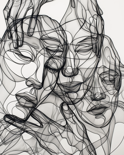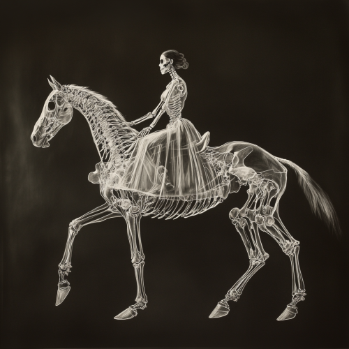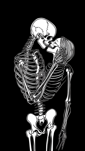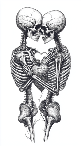 make a line art drawing of a male and female skeleton in an embrace. The female has her head on the males chest and her hand is in his chest cavity holding his heart. Isolate on a black background --ar 9:16