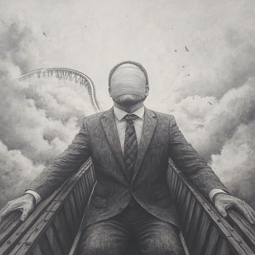 fear, chaos, show me a realistic drawing with a professional business man riding a rollercoaster blindfolded, add slight forex trading elements, make it in a professional way, no background, and grey shades only