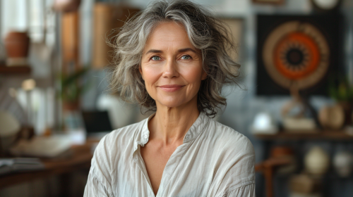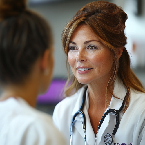 An otolaryngologist in a modern office setting. She is around 50 years old, with brown hair styled in a bun, and has an American appearance. She is wearing a crisp white lab coat with a stethoscope around her neck. The doctor is focused as she examines a patient with an otoscope, showcasing her attentiveness and care. The environment is well-lit, featuring visible otolaryngology equipment like an endoscope and other instruments. The emphasis should be on the doctor's face, highlighting her determination and empathy --v 6.1 --s 750
