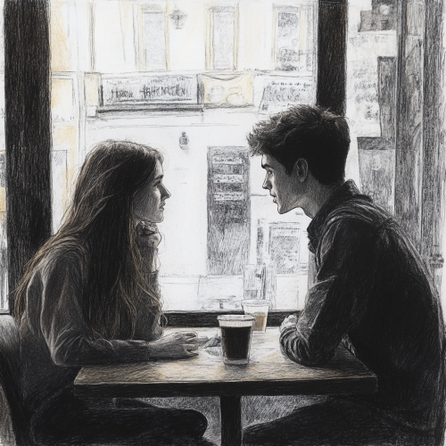 a color graphite skwtch of a young couple sitting together outside at a cofee shop both are in an unhappy monotone mood looking at eachother looking from a distance