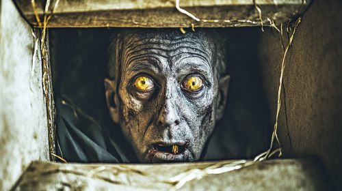 CLOSE UP dangerous strong large deadly human male monster confident predator faint small yellow eyes no emotion strips of decomposing tissue on black skin deformed nubbed fingers and hands in a dark lightless coffin looking ahead no emotion scary noir lighting color --ar 16:9 --weird 2000 --v 6.1 --style raw