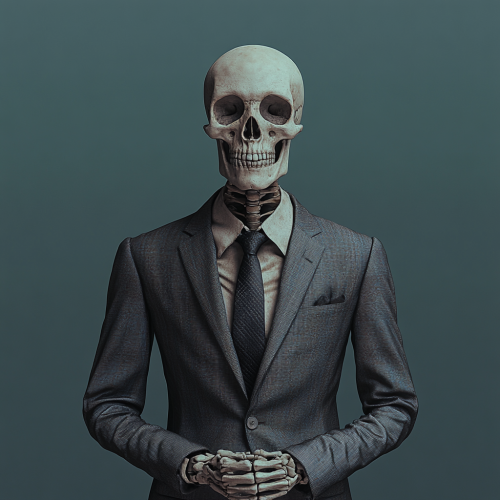 a high quality realistic image of a skeleton wearing a suit, jacket, shirt and tie and trousers. You can see the whole body of the skeleton, and he is standing at 45 degree angle with his hands clasped in front of his body
