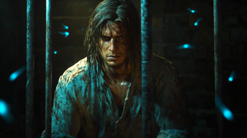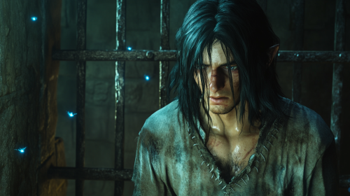 wounded full body Link in Breath of the Wild, imprisoned in dark and cold jails, with long disheveled and tangled hair, vulnerable worried face, light and damaged, dirty shirt, a few small blue fireflies around him, cinematic, realistic --ar 16:9 --v 6.1