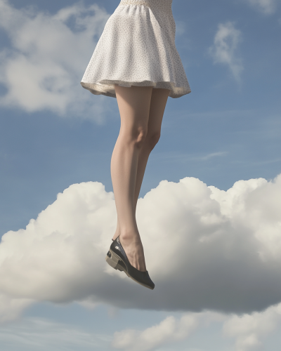 mand a woman walking. woman walks normally. mad walks upside-down, legs up, walking on a cloud and head hanging down. photorealistic. in the style of Geof Kern --ar 4:5 --v 6.1 --s 50