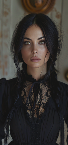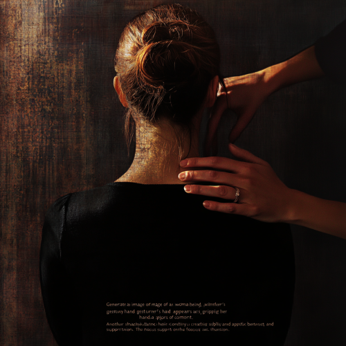 A Latina woman with loose hair, walking gracefully, with only her back visible. Her partner’s hand is gently resting on her back, conveying a sense of comfort and support. In contrast, another hand is pulling lightly at some strands of her hair, adding a layer of tension to the scene. The focus is on the woman, emphasizing her figure and the intimate connection, with a soft and inviting background that enhances the warm, loving atmosphere.
