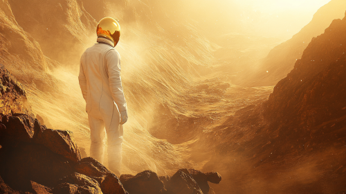 high resolution realistic photography, close up on the back of a human being, background is a dramatic valley landscape of a red planet with a human being wearing a white spacesuit with a golden helmet in the middle of the image. real mountain textures, dust. Dramatic light. --ar 16:9