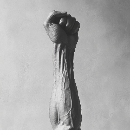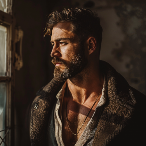 a man where you see the beauty of the body, details of muscles and skin, hair and the beauty of the face. but also the imperfection. this man wears distinctive clothing --ar 1:1 --v 6.0 --s 250 --style raw