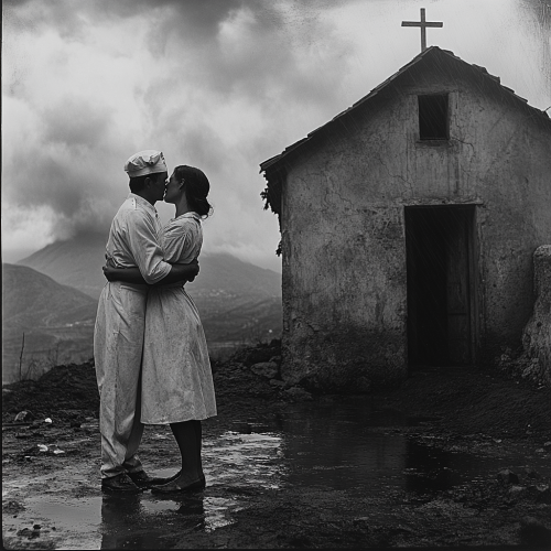stills from a black and white Pulitzer Prize winner of a nurse holding a dying man in front of a small chapel in the rain in Santiago Chile in 1942 --s 250