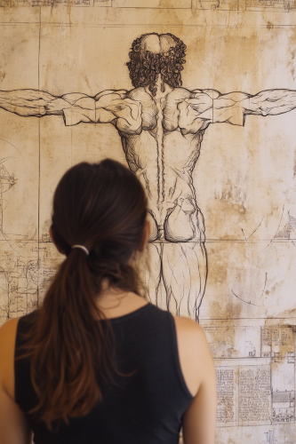 a sketch of a woman in the style of the virtuvian man by leonardo da vinci, the woman is overlayed into the sketch with the man to the background of --ar 2:3