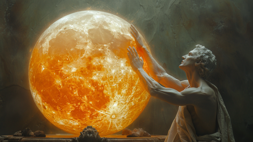A hyper-realistic photograph of Atlas, the Greek Titan, muscular and powerful, struggling under the weight of a massive orange glowing celestial sphere on his shoulders. The sphere has a glass-like translucent quality with swirling cosmic patterns. Atlas's face shows determined expression and strain, with detailed skin texture and beads of sweat. His body is sculpted and anatomically accurate. Shot in 8K resolution with a Canon EOS R5, dramatic lighting emphasizing shadows and definition. Photorealistic rendering, volumetric fog adding atmosphere, shot from a slightly low angle to emphasize monumentality. --ar 16:9 --v 6.0 --s 750