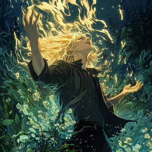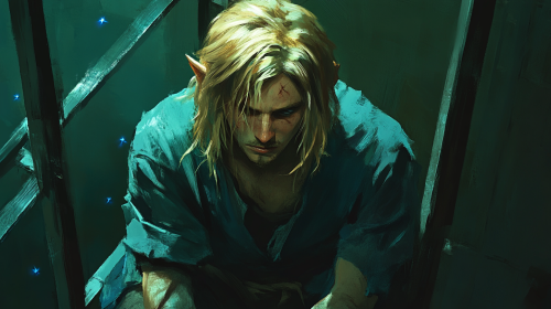 wounded full body Link in Breath of the Wild, imprisoned in dark and cold jails, with long blond and disheveled hair, vulnerable position, worried face, asian eyes, light and damaged, dirty shirt, a few small blue fireflies around him, cinematic, realistic --ar 16:9 --v 6.1