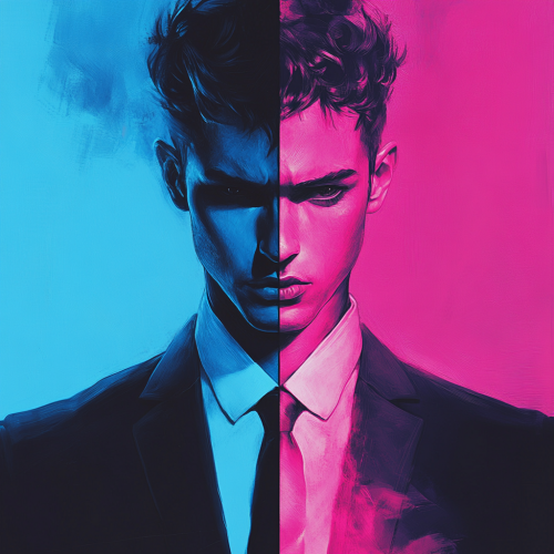 a split imagine with one half being blue and the other half being pink. In the blue part create a masculine man and in the pink part make similar man but make him feminine