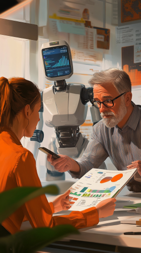 generate a photorealistic image of a scene where a bookkeeper and a small business owner are facing each other in a cozy office setting. The bookkeeper, is showing a detailed financial report with datas to the business owner, who has an expression of joy and relief. The report features positive financial data, including graphs and charts. Behind the bookkeeper, a low visibility of an AI robot with a friendly demeanor is observing the interaction, holding a small tablet displaying additional financial insights. The background should reflect a simple and modern white. Utilized color peach in theme --ar 9:16