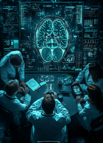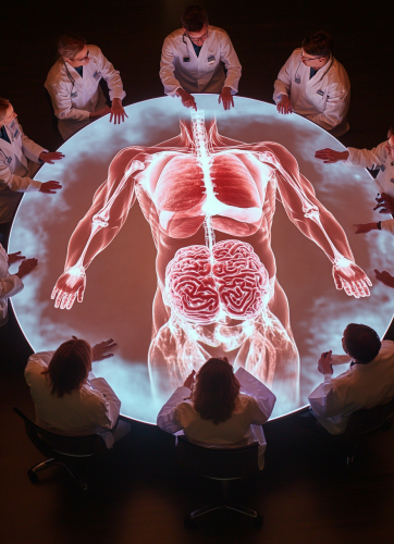 Top view, 6 male and female doctors sitting at a round table examining a 2 meter high hologram of the human body located in the center of the table. Minimal setting, light backgrounds. Neon and soft light in the doctor's office, ultra realistic, sony alpha 7 IV camera. --ar 21:29 --s 400 --c 60