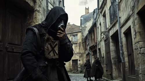 A powerful image of the black plague in France in 1348 - the city streets are almost empty. The doors of the houses are marked with an X. A few lonely people on the street hold a dirty handkerchief over their mouth and nose. Cinematic lighting. Super realistic. --ar 16:9 --s 50