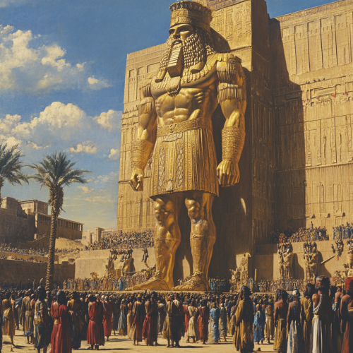 King Nebuchadnezzar's 90 foot tall Golden statue of himself in Babylon, the men standing in front of it, and a crowd of people bowing down to the statue on the side