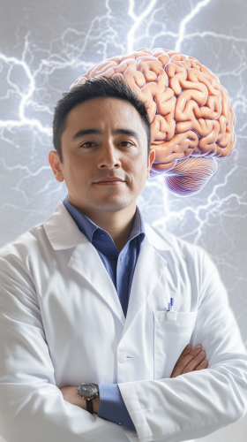 high definition and hyper detailed and photographic iamge of latino doctor with white coat and behind him a human brain on a clear and bright background. The brain has lightnings around it. --ar 9:16