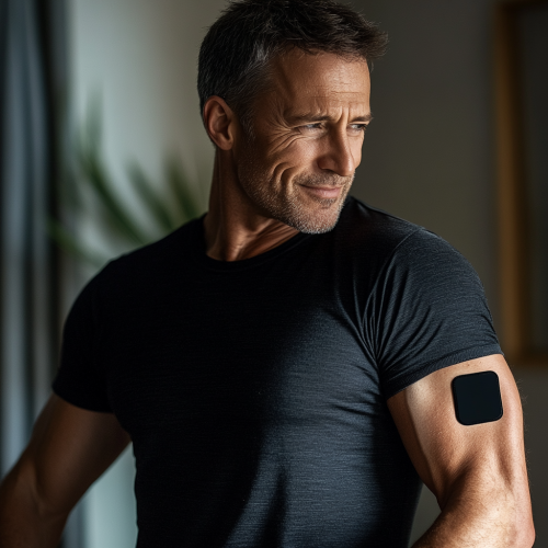 A man in his 40-50's is wearing a tiny black pain relief patch on his upper arm. He is standing up and looking at it with curiosity. He has short hair and facial stubble. The setting appears to be a modern home interior, and there is some natural light illuminating him from behind. His posture suggests that he may have just finished working out or engaging in other physical activity, which led him to take off his t-shirt for relief, .This photo was taken using Canon EOS R5 mirrorless camera, with an EF lens set to f/20, ISO 8D, capturing every detail of his smile and her warmth., ultra-realistic photograph captured, high-resolution 3d rendering --v 6.1