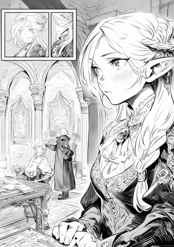 Japanese manga-style comic page in black and white, set in a medieval Spanish-inspired room with stone walls and arched windows. A wise, human elder headmaster with no elf features, wearing ceremonial robes, speaks seriously to Yuzha Riko’s parents about her lack of magical talent. The elder has an authoritative expression, while Riko’s parents, dressed in simpler medieval attire, show subtle signs of disappointment. The father looks down thoughtfully, and the mother’s expression is visibly saddened. Riko is not present in this scene. Detailed linework and shading emphasize the tense and serious atmosphere, medieval Spanish fantasy style, all characters are human --ar 7:10 --niji 6