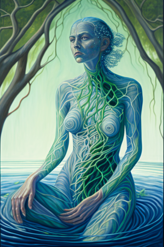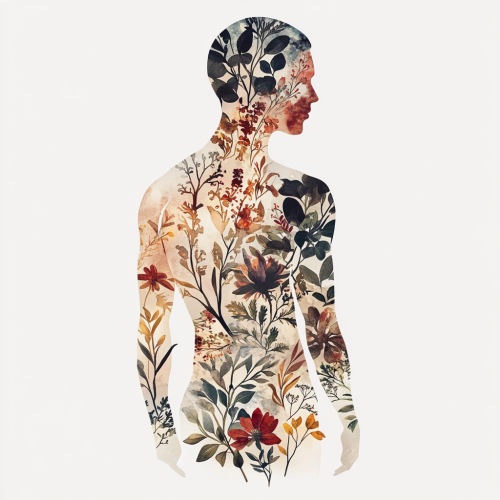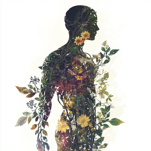 soft and light design of a Human Silhouette, inside of the shilouette is an intricate paintings of flowers and leaves in the style of ink and watercolor representing growth and the beauty of nature within every person. This design shows how humans carry nature within themselves, white background