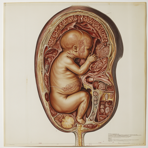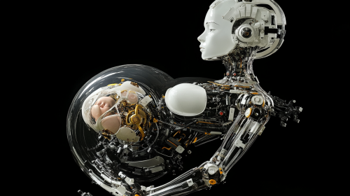 Pregnant female android, profile view. A transparent abdomen with a mechanistic embryo is seen. Very high detail of parts and mechanisms. Photorealistic image. --ar 16:9