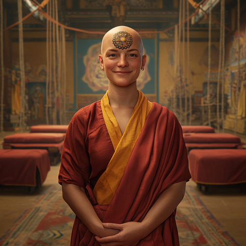 Photorealistic image, bald woman with a serene smile, with mandala tattoo on her forehead wearing red and yellow Tibetan Buddhist monk robes stands in a large room with several padded tables, an X-shaped cross, and ropes hanging from the ceiling. In the background is a thangka of Red Tara.