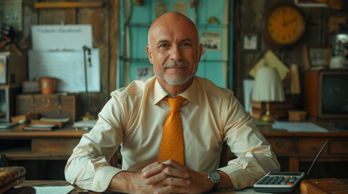 A super hyper-realistic medium-wide shot of a bald Venezuelan male accountant in his mid-40s, dressed in a light-colored shirt and tie, seated at a well-organized desk in a modest but welcoming Latin American office. His warm smile and friendly, approachable expression convey a sense of trust and reliability. The desk, neatly arranged with a calculator, financial reports, and a desktop computer, reflects his professionalism. Bright, natural lighting from a nearby window illuminates the scene, enhancing a positive and inviting atmosphere. Captured using iPhone amateur camera, ultra-high resolution, dynamic lighting, vibrant color saturation, natural depth of field --ar 16:9 --v 6.0 --s 1000 --style raw --c 10