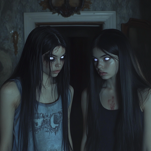 two teenagers staring at each other in a haunted house, they have no pupils just pure white eyes. They look spooky and have a full head of long black hair. They are wearing disney tank tops and jean daisy dukes