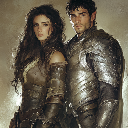 a old drawn portrait of an elvish woman with very long messy curls in leather armor and tall handsome human male in silver full armor, shoulder length dark hair and stubble, fantastical