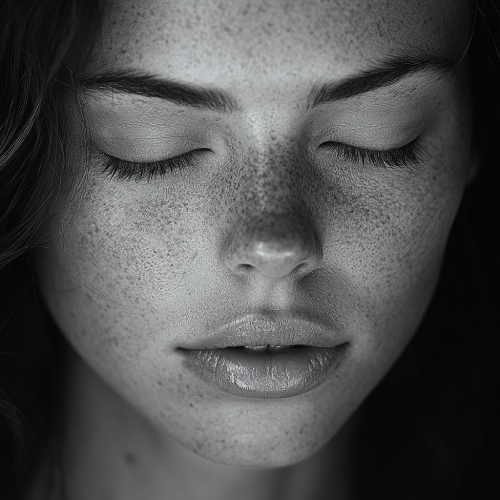 Symmetrical medium close up of average woman’s face with eyes closed, straight shot, high contrast , high quality portrait black and white photography, tragic, symmetrical and centered, dusky skin, eyes closed and lips slightly parted --chaos 30 --stylize 550 --v 6.1